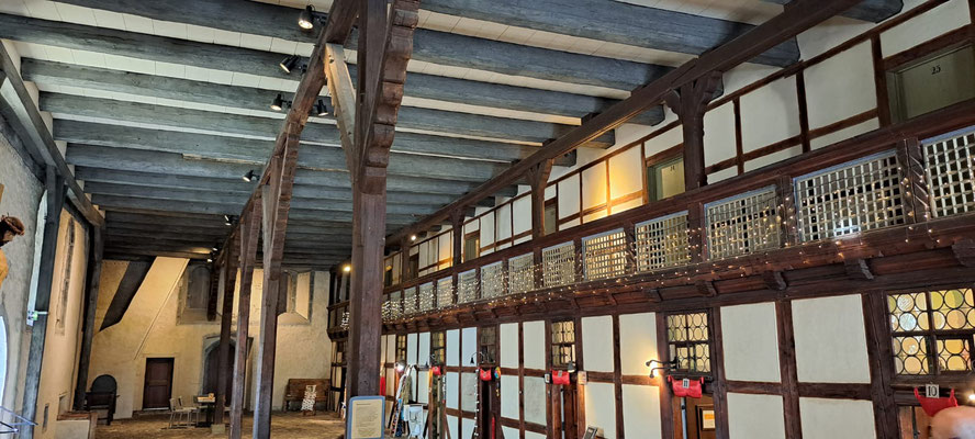 Nach dem Mittagsessen im Museumscafé ging es weiter zur Burg Vischering in Lüdinghausen mit ihrer neu entwickelten Dauerausstellung. Auch diese Führungen boten viel Wissenswertes und waren anschaulich, dabei ging es u.a. um die Bezüge der Burg und ihrer jeweiligen Herren zu den großen historisch-politischen Entwicklungen und Verwerfungen durch die Jahrhunderte. Besonders begeisterte die künstlerisch gestaltete Installation einer mittelalterlichen Tafel. Anklang fanden auch das Backhaus vor der Burg, aus dem heraus leckeres Brot verkauft wurde, und das kleine Burgcafé.