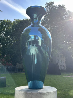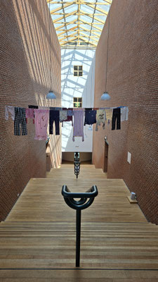 Vormittags stand eine Führung durch die umfassende Werkpräsentation der Konzeptkünstlerin, Filmemacherin, Fluxuspionierin, Musikerin und Friedensaktivistin Yoko Ono auf dem Programm. Sie begann bereits im Foyer, wo uns der kompetente Guide auf ein kleines aus dem Putz einer Säule ausgestanztes Quadrat aufmerksam machte, an dem wir sonst sicherlich achtlos vorbei gegangen wären. Die Ausführungsanweisung für dieses Werk kommt stets von Ono bzw. ihrem Team aus New York, das Konzept, das die Frage nach dem“ was steckt dahinter“ aufwirft. Die Anwesenheit der Künstlerin ist nicht nötig.